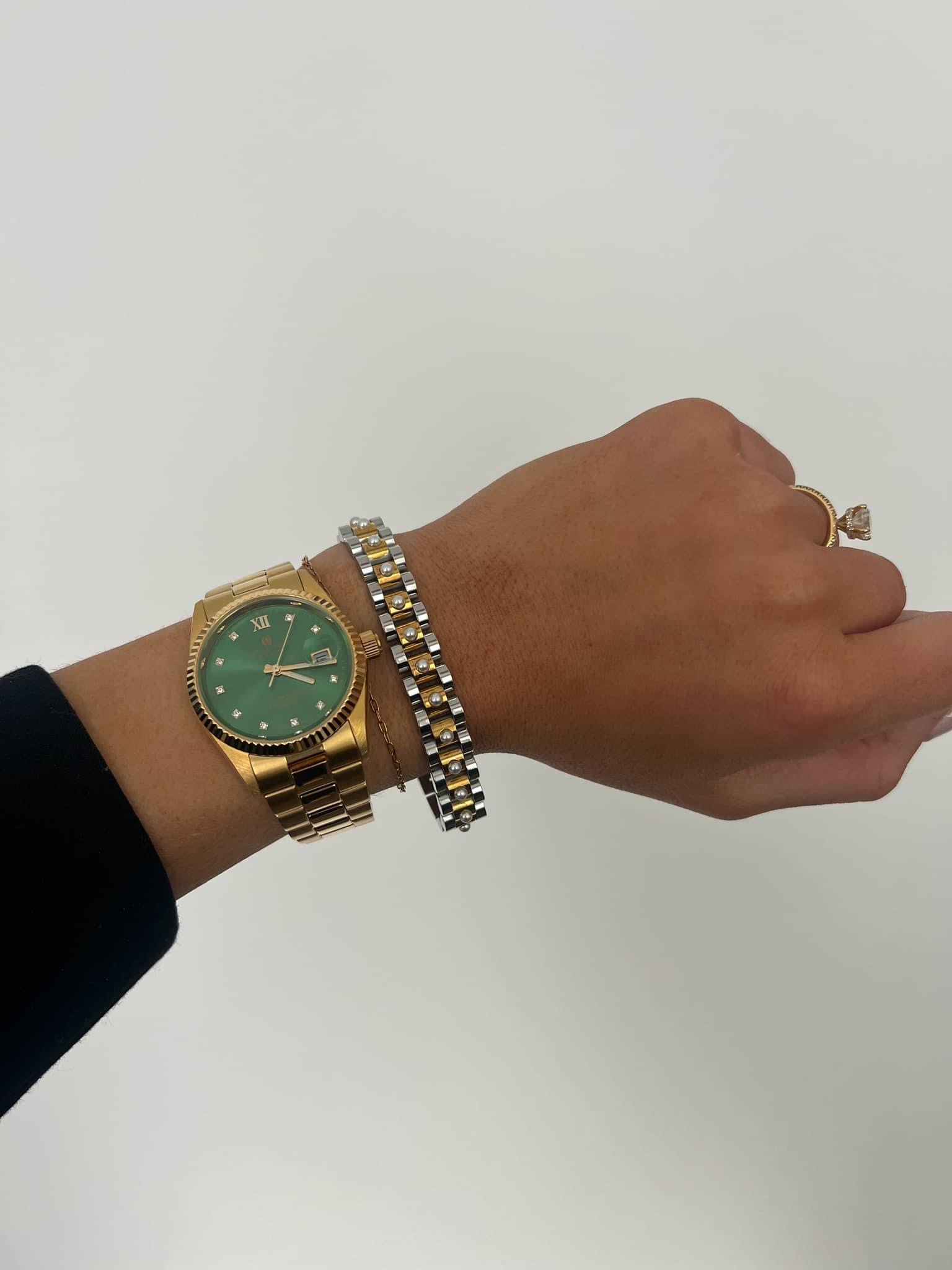 Upgrade your look with our Pearl Studded Two-Toned Watch Band Bracelet. The unique style and pearl embellishments add a touch of elegance to any outfit. Elevate your fashion game with this stunning accessory.