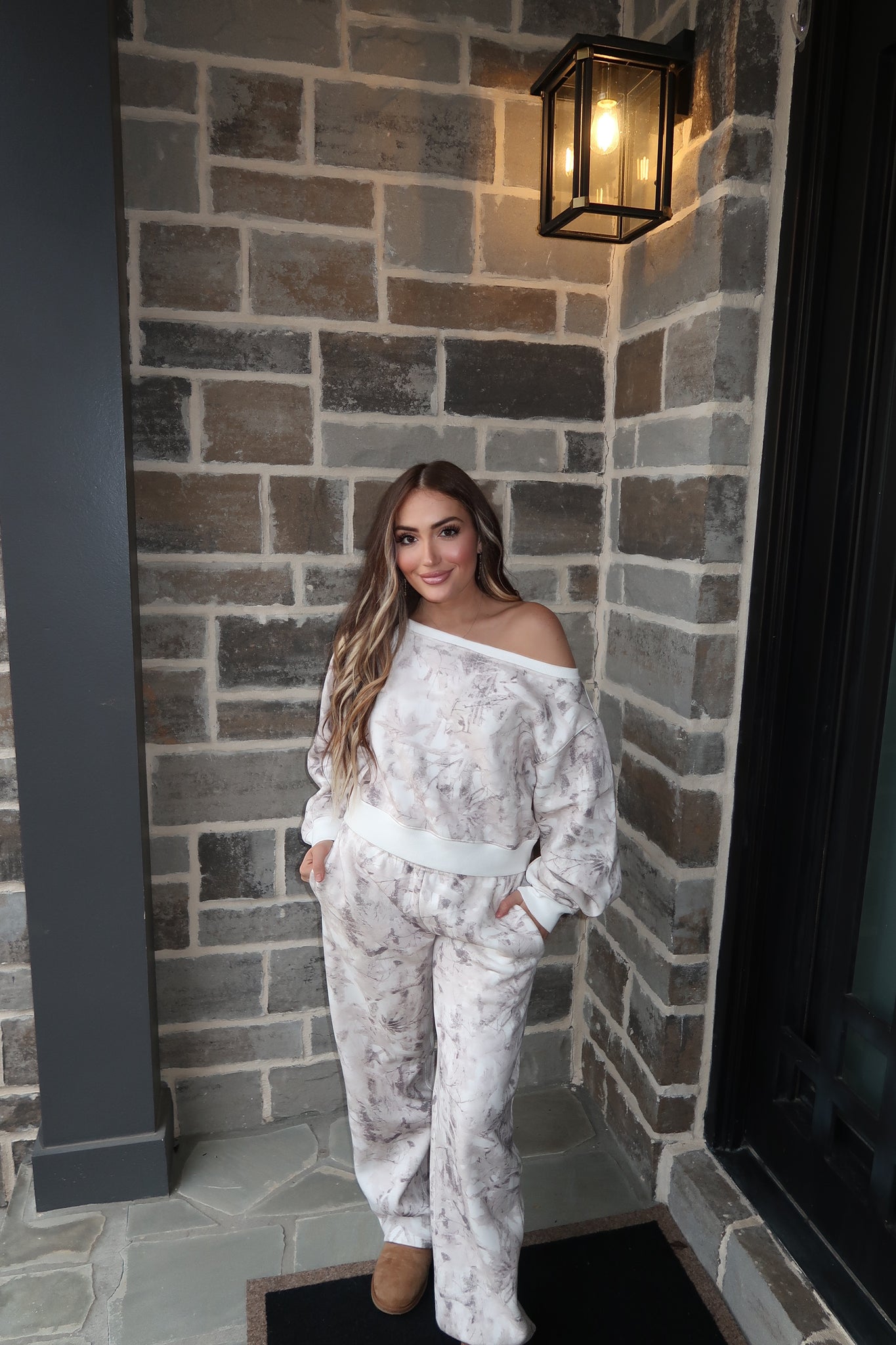 Cozy, relaxed, and easy to style. The Monroe Sweater features a soft off-the-shoulder fit in our new cloud fleece fabric with a light grey woodland camo pattern. Lightweight, drapey, and perfect for everyday wear.