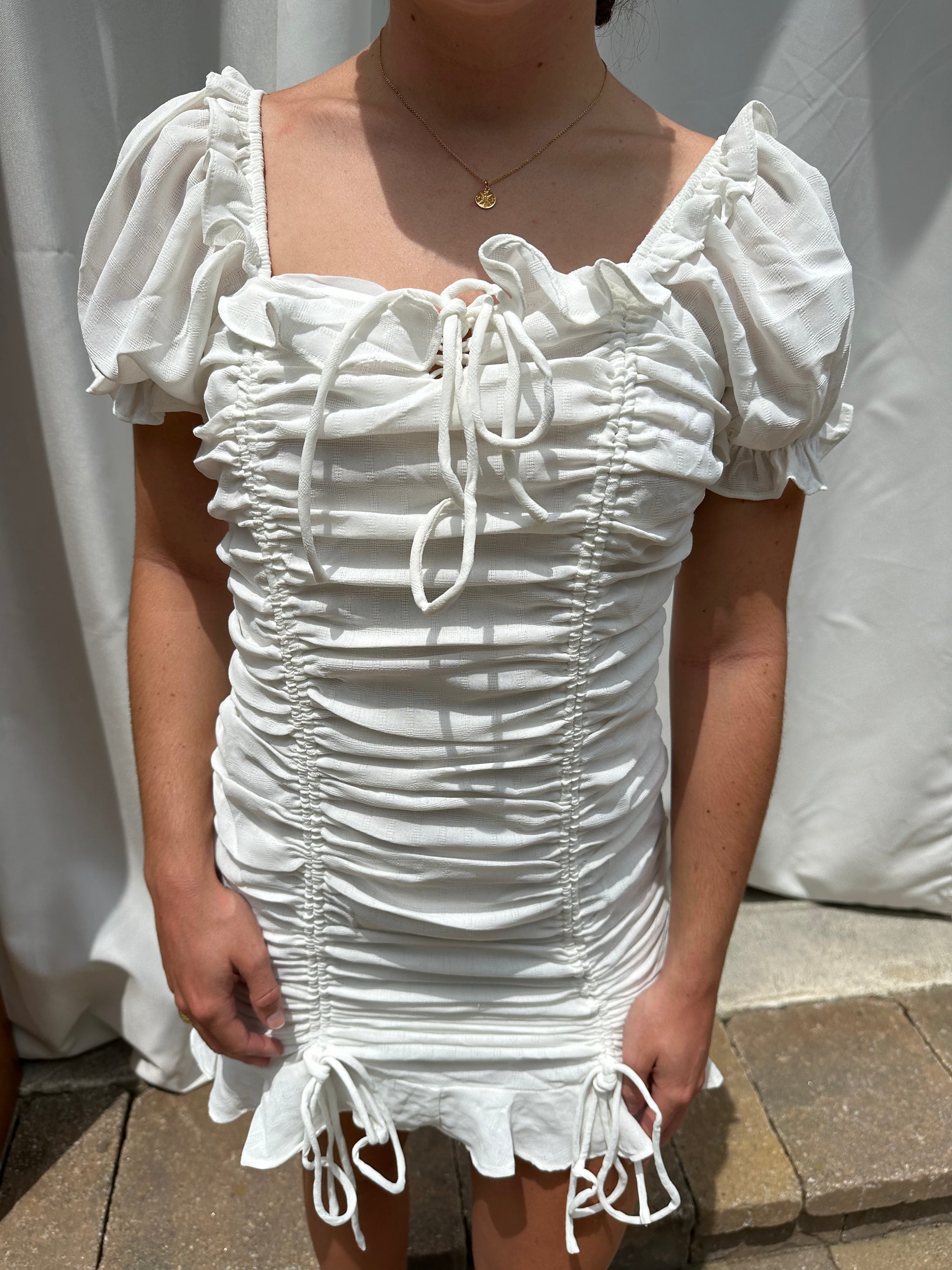 Look no further for the perfect dress: the Maria Puff Sleeve Mini Dress has all your occasions covered! With ruched detailing and a classic white color, you'll be ready for anything - from brunch to a night out - in this stylish stunner!