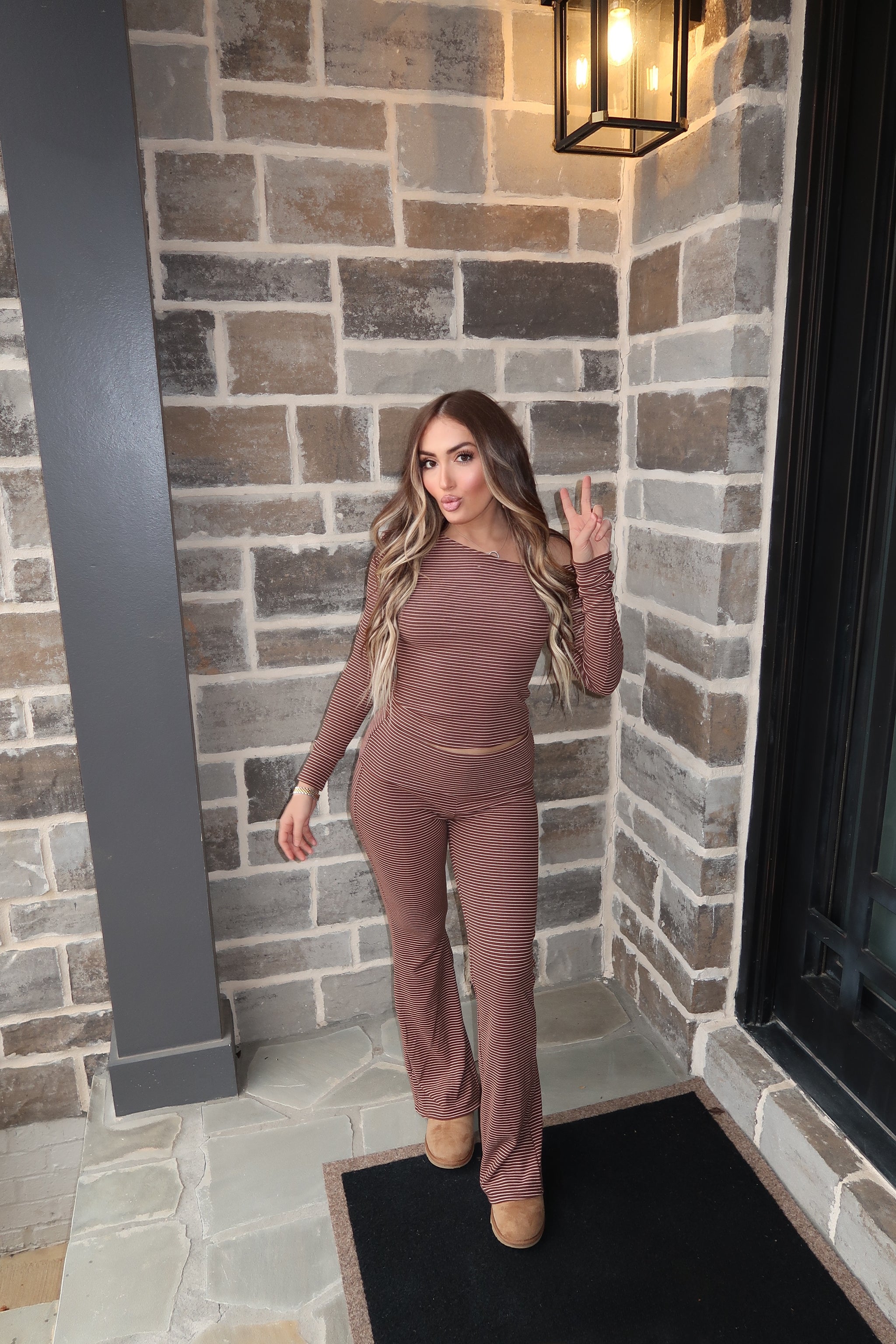 A bold, fitted one-shoulder top made from soft ribbed knit fabric with warm brown stripes. Stretchy, flattering, and perfect worn alone or paired with the matching Kamryn Flare Pants.