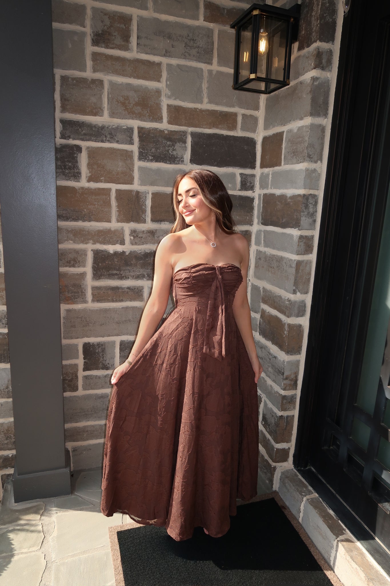 Romantic and refined with a soft, feminine touch. The Lola Maxi features a floral-embossed texture, strapless sweetheart neckline, and front-tie detail. Designed with an open back, elastic band, and back zipper for a smooth, flattering fit.