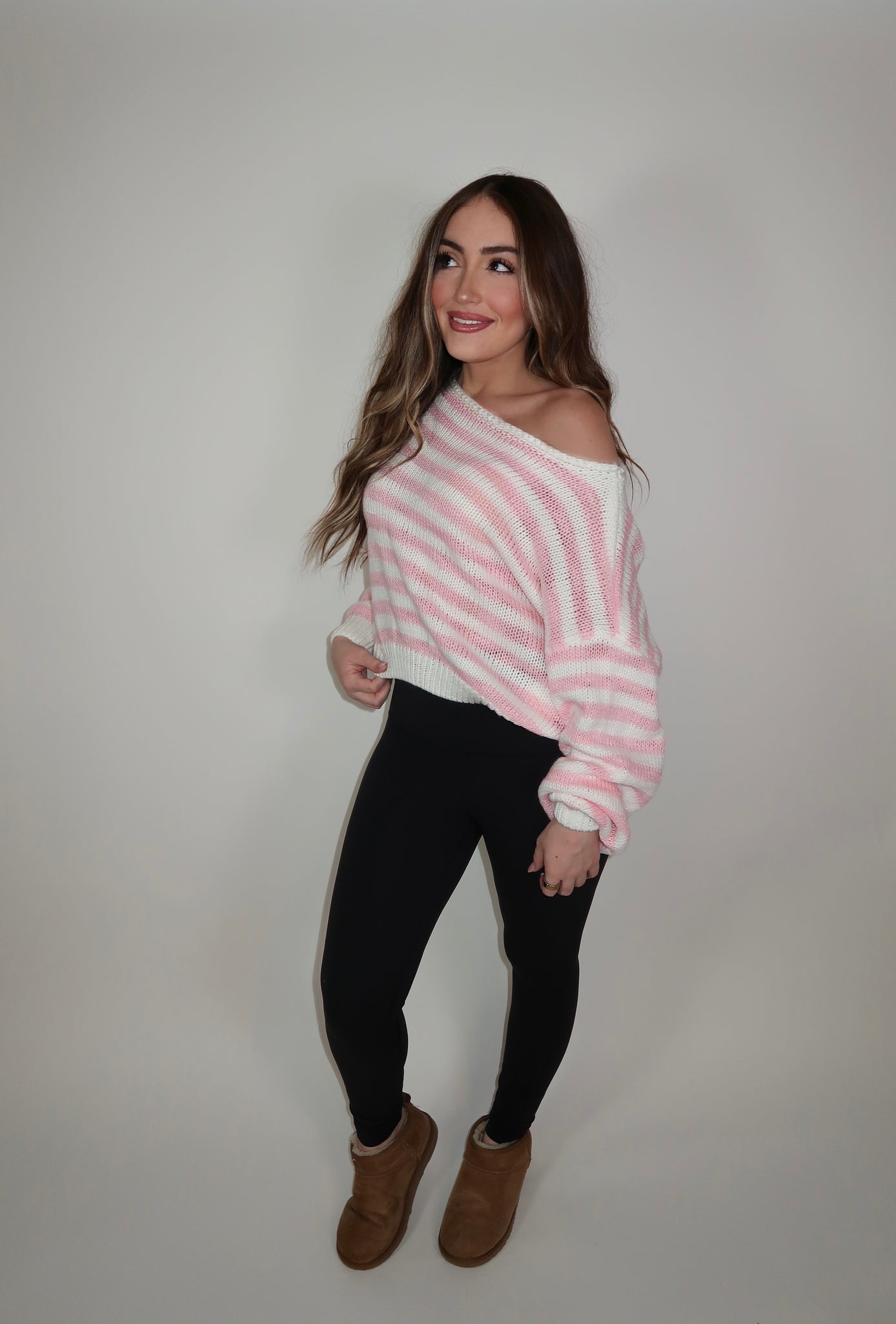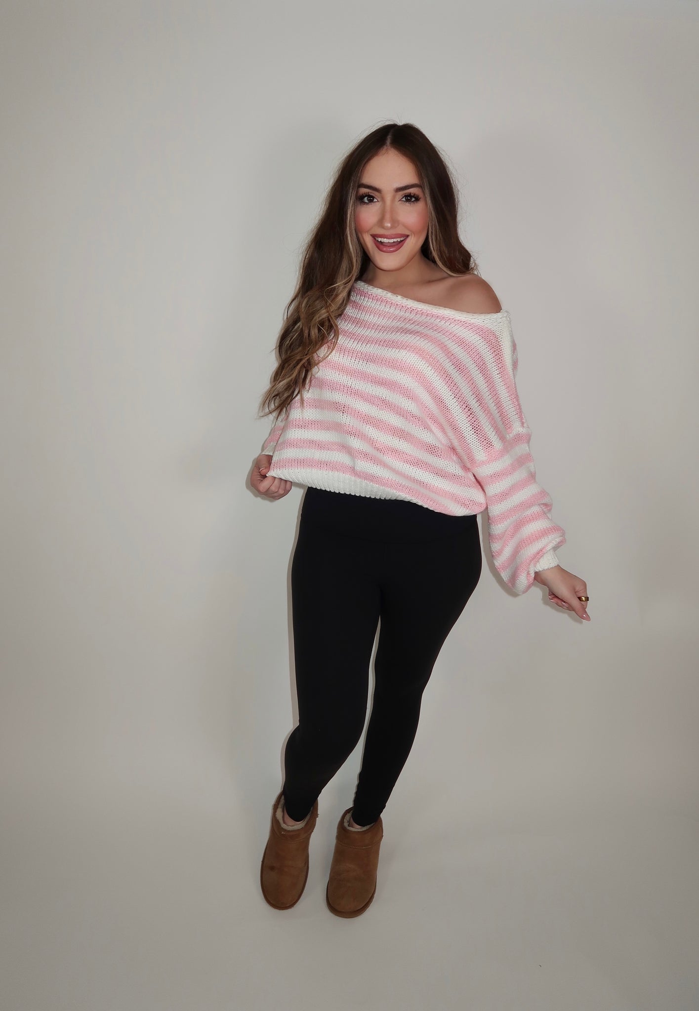 Camille Striped Knit Off The Shoulder Sweater- Pink