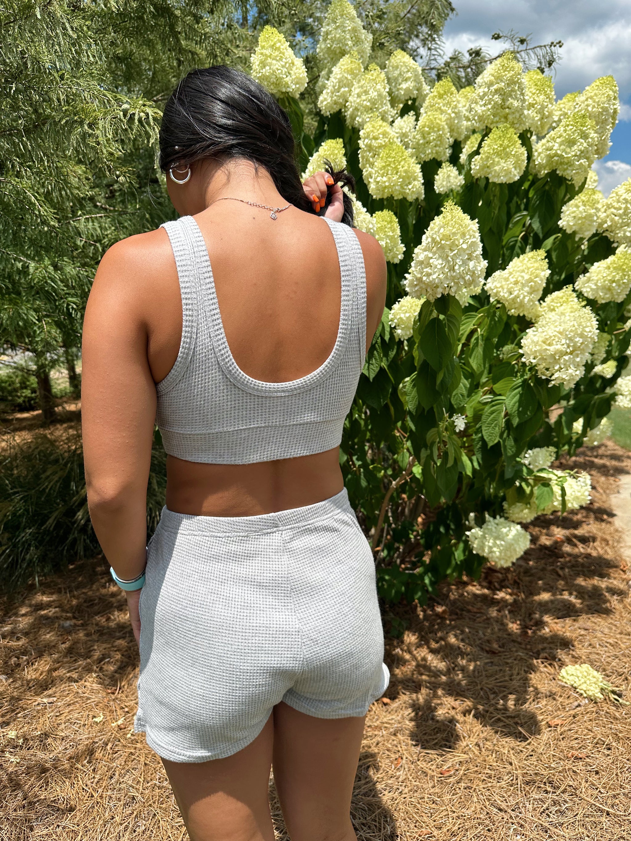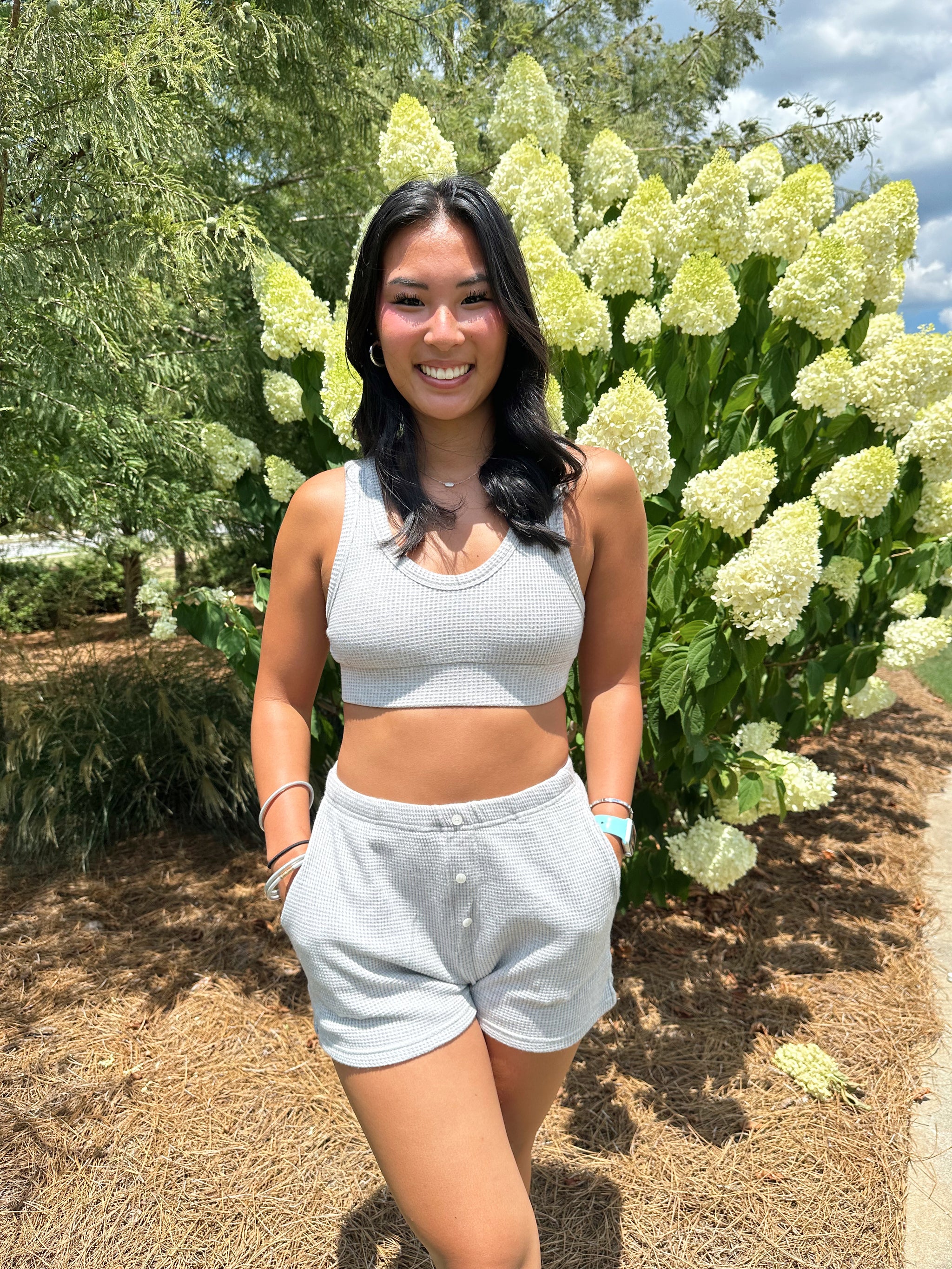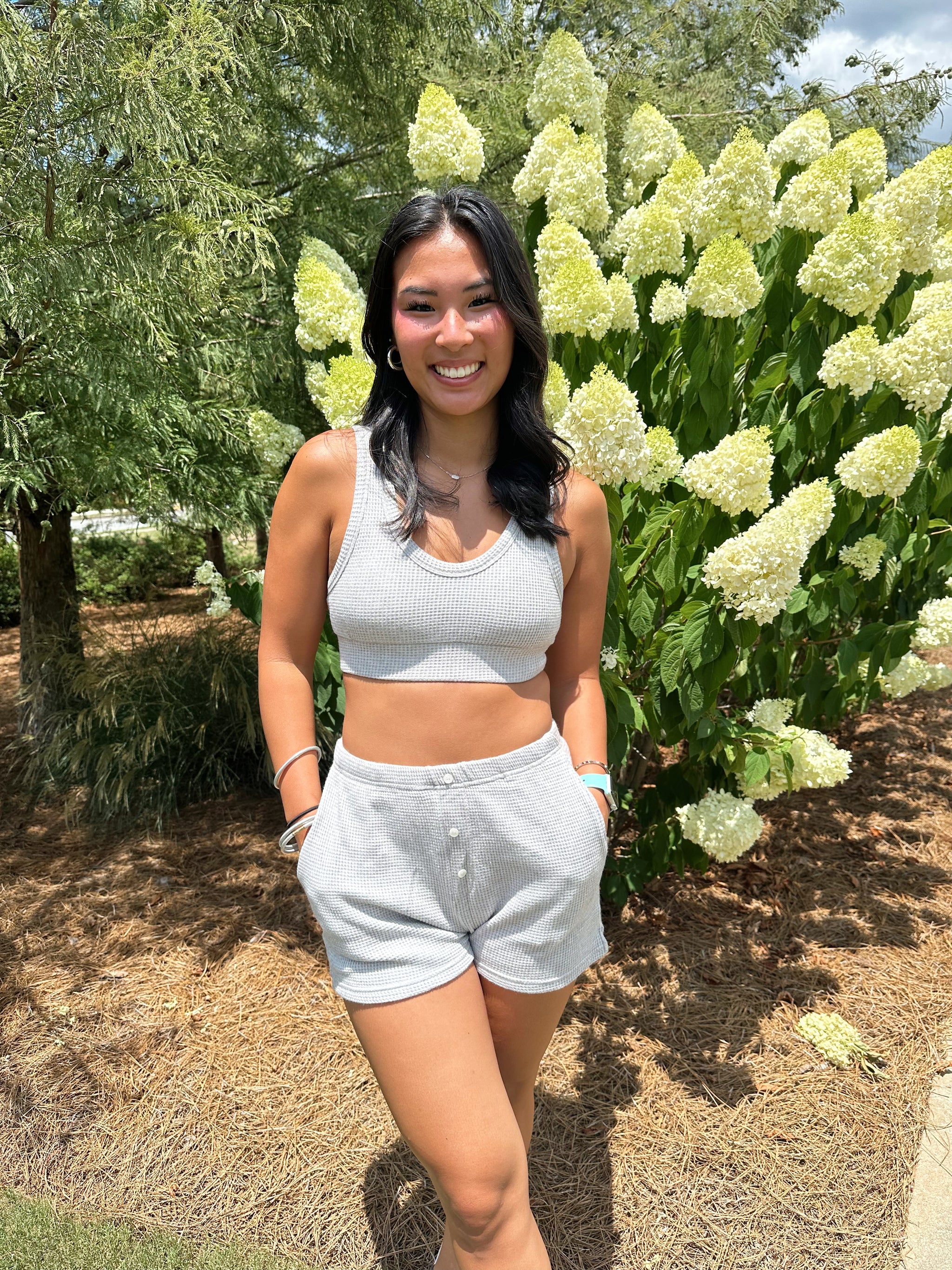 Introducing the Westlyn Waffle Lounge Set! Stay effortlessly put-together while feeling cute and comfortable. The tank top features built-in padding for extra support, while the shorts have functional pockets for added convenience. Look and feel your best in this must-have lounge set.